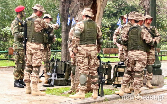 Αρματωμένοι με τις εξαρτήσεις τους και με τις μπότες γυαλισμένες, αξιωματικοί του ελληνικού στρατού πέρασαν λίγη ώρα χαλάρωσης λίγο πριν το… εναρκτήριο λάκτισμα για την παρέλαση.