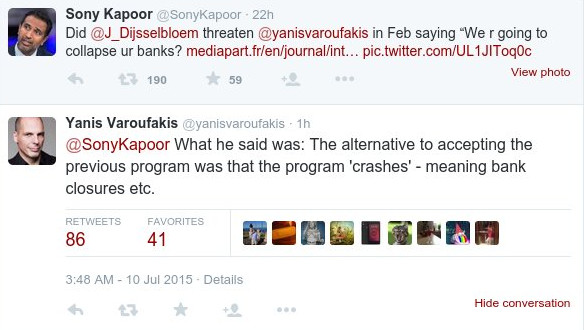 Συγκεκριμένα, όταν ο διευθυντής του Think Tank ReDefineEurope τον ρώτησε μέσω Twitter αν αληθεύει η είδηση ότι ο πρόεδρος του Eurogroup Γερούν Ντάισελμπλουμ τον απείλησε λέγοντας του: «Θα κάνουμε τις τράπεζες σας να καταρρεύσουν», ο κ. Βαρουφάκης απάντησε: «Αυτό που είπε ήταν: Η άλλη εναλλακτική από την αποδοχή του προηγούμενου προγράμματος ήταν ότι το πρόγραμμα “θα συντριβόταν”, εννοώντας το κλείσιμο των τραπεζών κ.α.