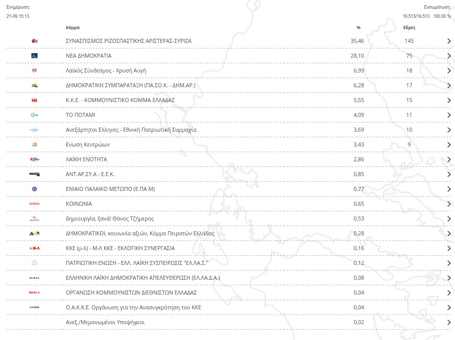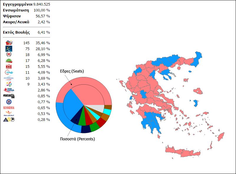 Με καταμετρημένο το 100% των εκλογικών τμημάτων τα κόμματα που συμμετείχαν στις εκλογές λαμβάνουν: