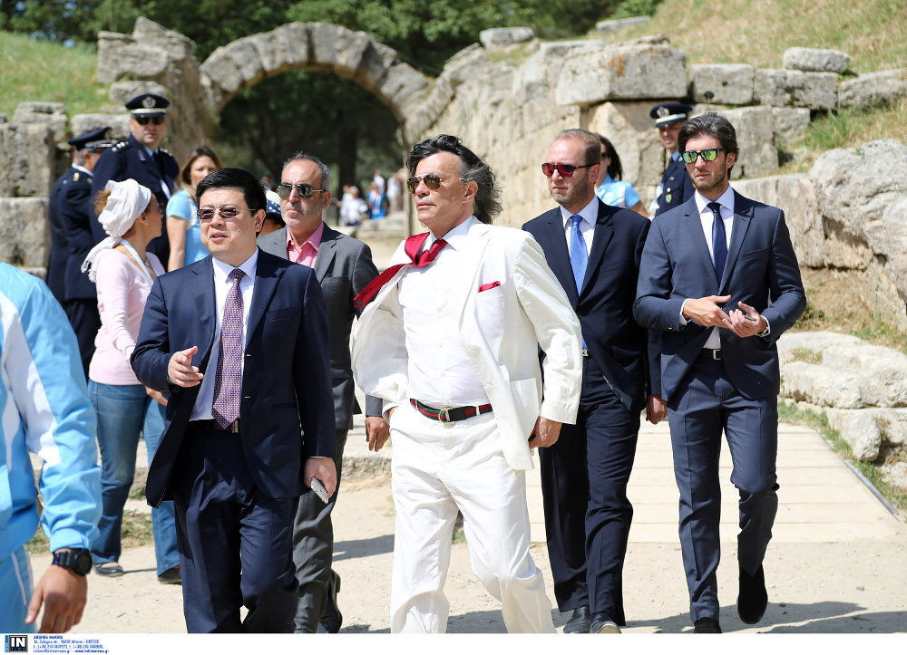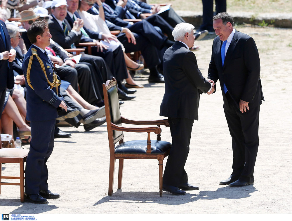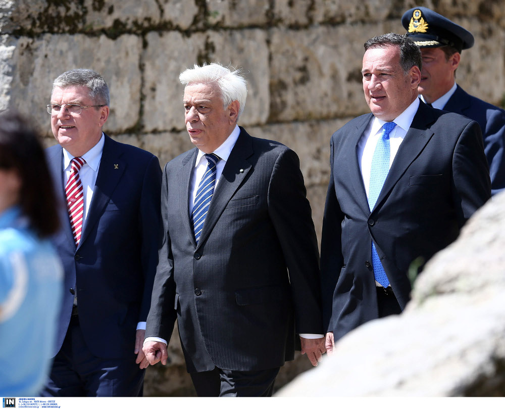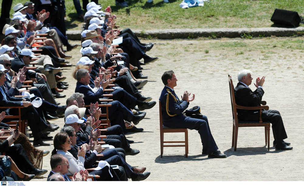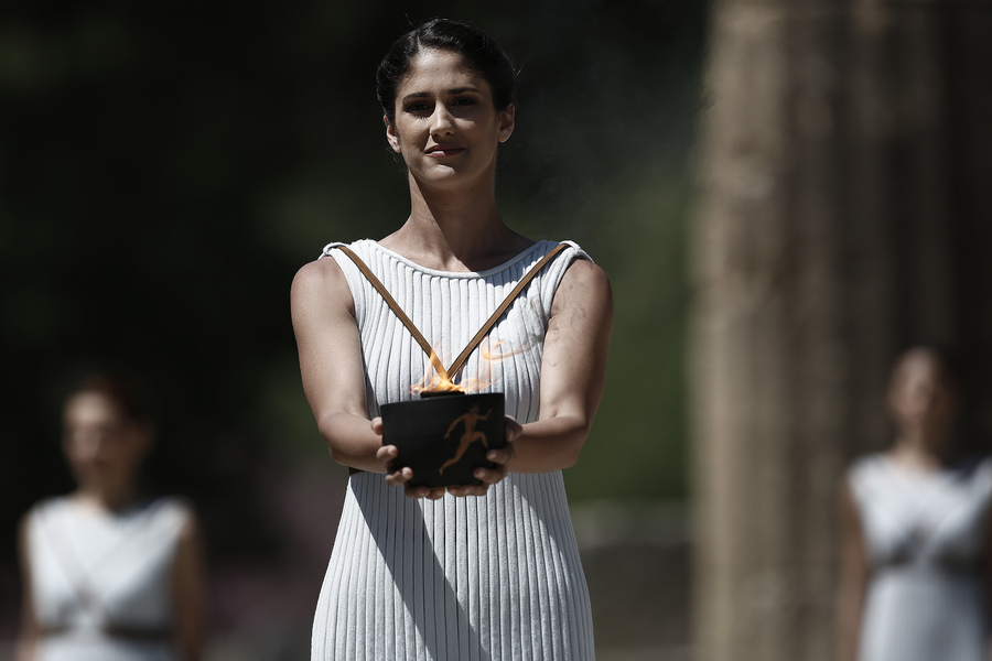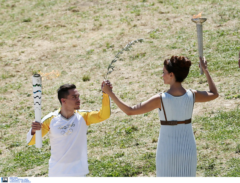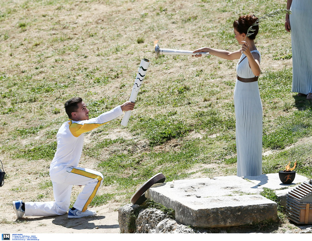Το ιερό Φως του Ολυμπισμού «γεννήθηκε» στα χέρια της Πρωθιέρειας Κατερίνας Λέχου που μεταλαμπάδευσε την Φλόγα στον πρώτο Λαμπαδηδρόμο, τον Παγκόσμιο Πρωταθλητή της γυμναστικής Λευτέρη Πετρούνια.