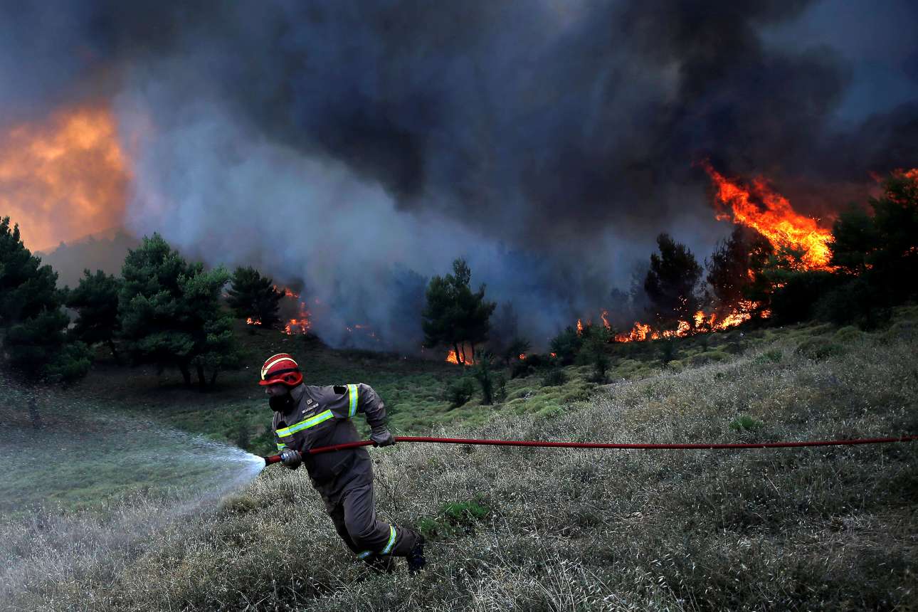 Ανήμερα Δεκαπενταύγουστος, με φόντο τις φλόγες ο πυροσβέστης προσπαθεί να απομακρύνει τον κόσμο