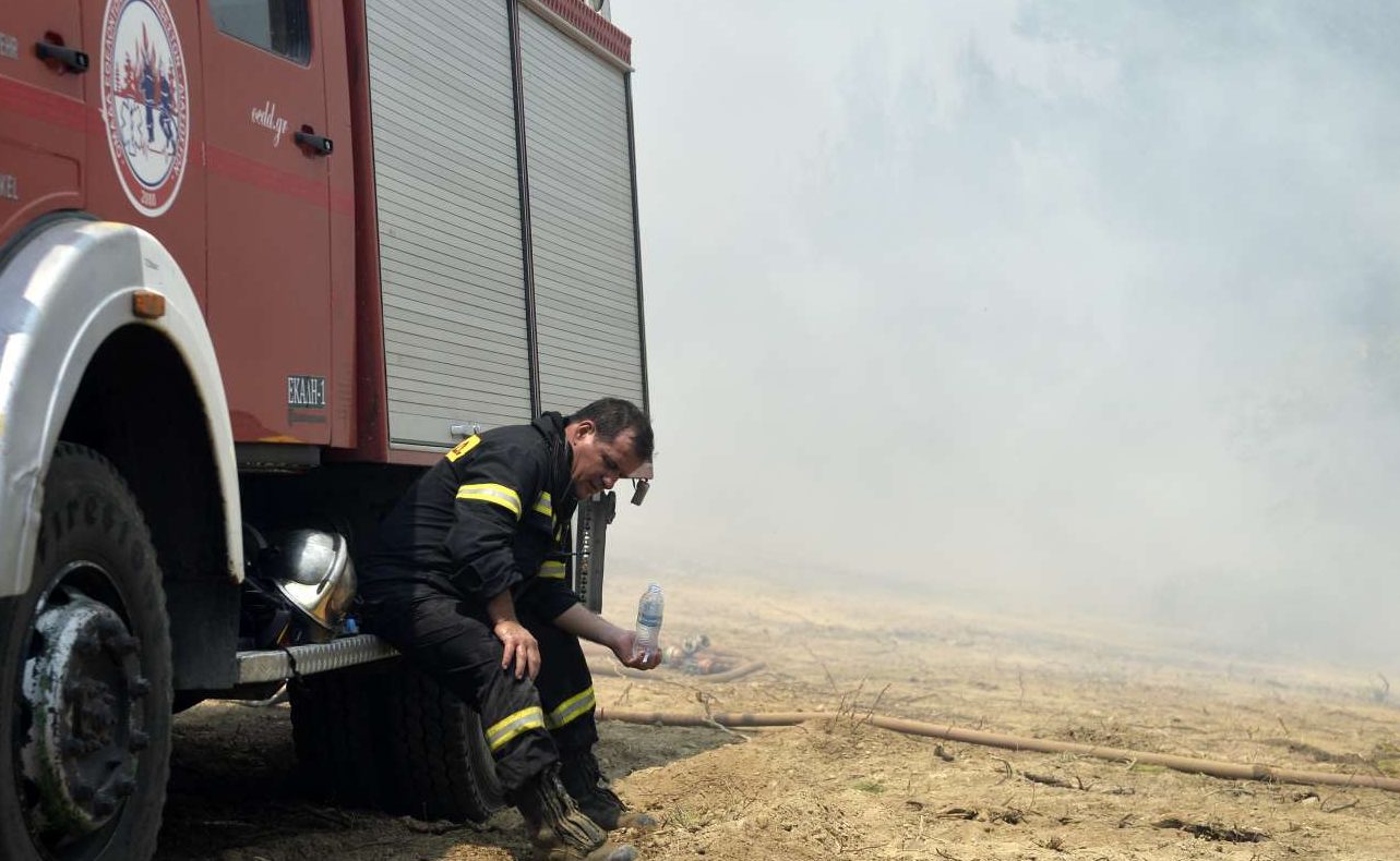 Ο εξουθενωμένος πυροσβέστης που προσπαθεί ρίχνοντας λίγο νερό