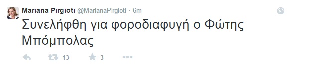 Ακόμα και η δημοσιογράφος Μαριάννα Πυργιώτη είχε αναρτήσει στο twitter, ότι συνελήφθη ο Φώτης Μπόμπολας για φοροδιαφυγή.